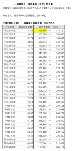 合格してからというもの、「この人はいつ頃合格したのかな?」と登録番号が気になるようになり、自分なりに早見表を作ってみました。番号を追っていくと、その年ごとの合格者数や時代背景も垣間見えてなかなか興味深いものです。